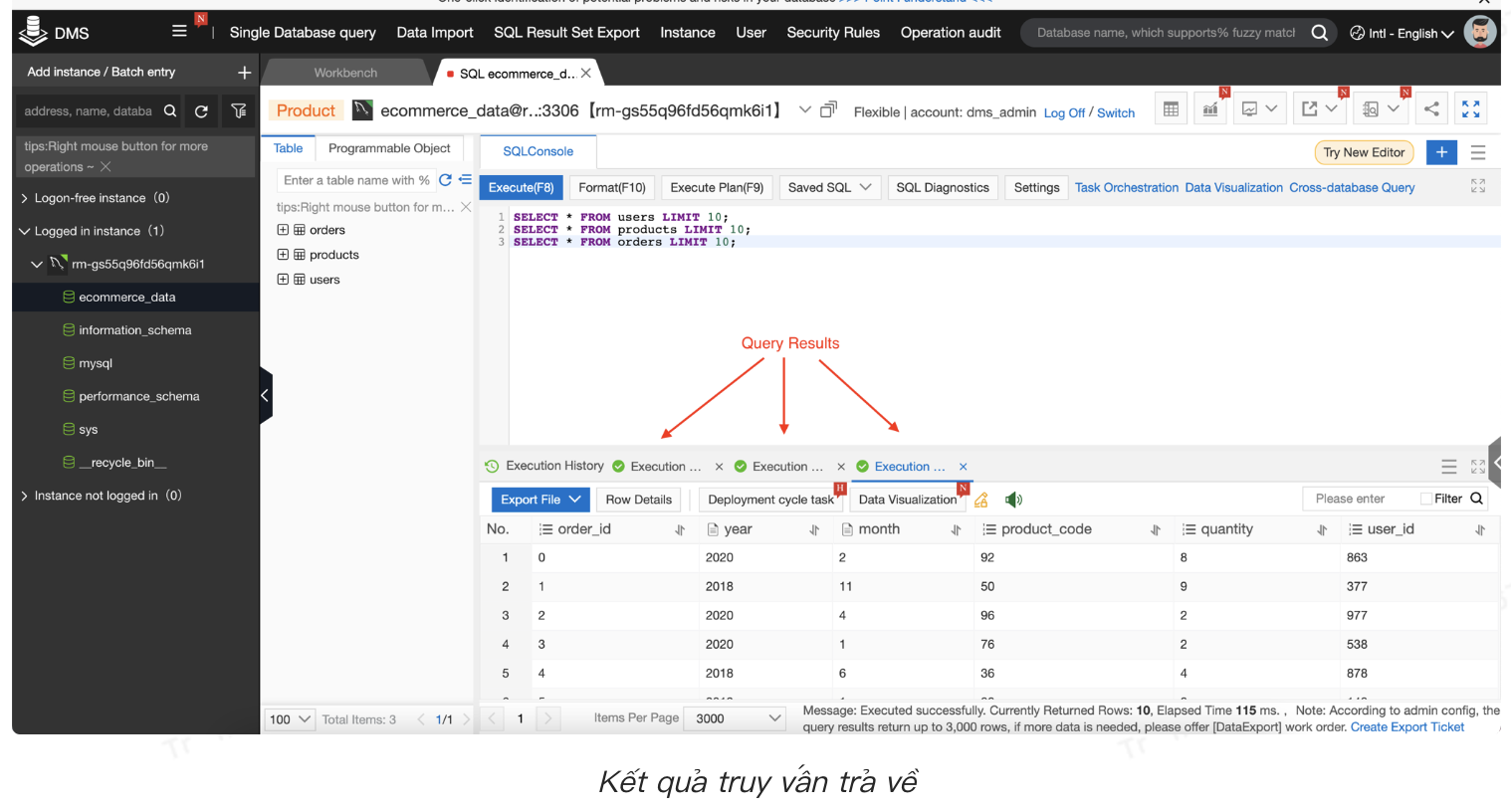 Sau khi đổ dữ liệu vào cả ba bảng, bạn có thể sử dụng SQL Console để truy vấn dữ liệu ngay trên DMS. Bạn có thể chạy lệnh SELECT đơn giản sau để kiểm tra dữ liệu: