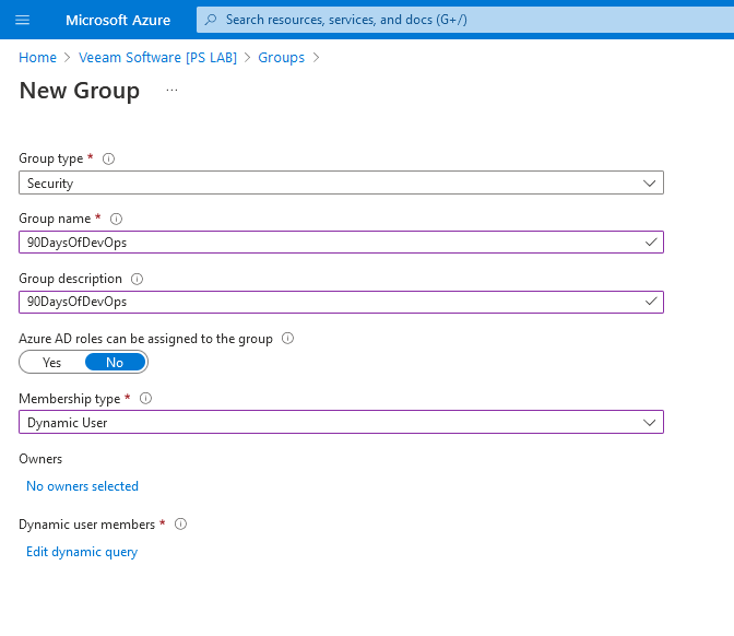 Giờ chúng ta muốn tại một nhóm cho tất cả những người dùng của 90DaysOfDevOps trong một nhóm. Chúng ta có thể tạo một nhóm theo hướng dẫn bên dưới, lưu ý rằng tôi đang sử dụng "Dynamic User", điều đó có nghĩa là Azure AD sẽ truy vấn các tài khoản và thêm chúng một cách tự động so với việc được chỉ định - khi đó bạn phải thêm người dùng và nhóm của mình một cách thủ công.