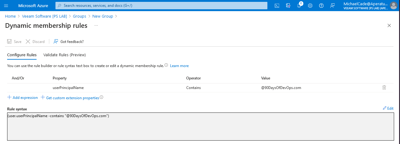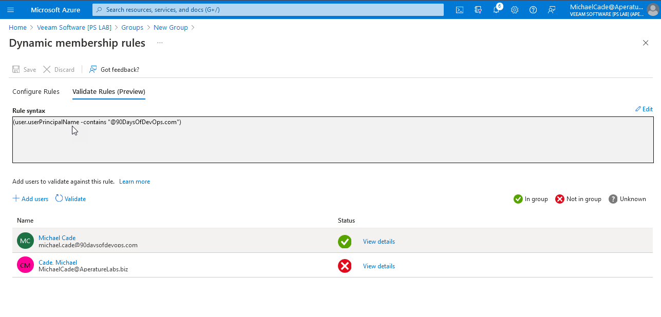 Vì tôi đã tạo tài khoản người dùng của mình dưới tên michael.cade@90DaysOfDevOps.com (thay bằng tên của các bạn ở đây) chúng ta có thể xác nhận xem các quy tắc có đang hoạt động hay không. Để so sánh, tôi cũng đã thêm một tài khoản khác liên kết với một tên miền khác tại đây và bạn có thể thấy do quy tắc này, người dùng của chúng ta sẽ không được đưa vào nhóm này.