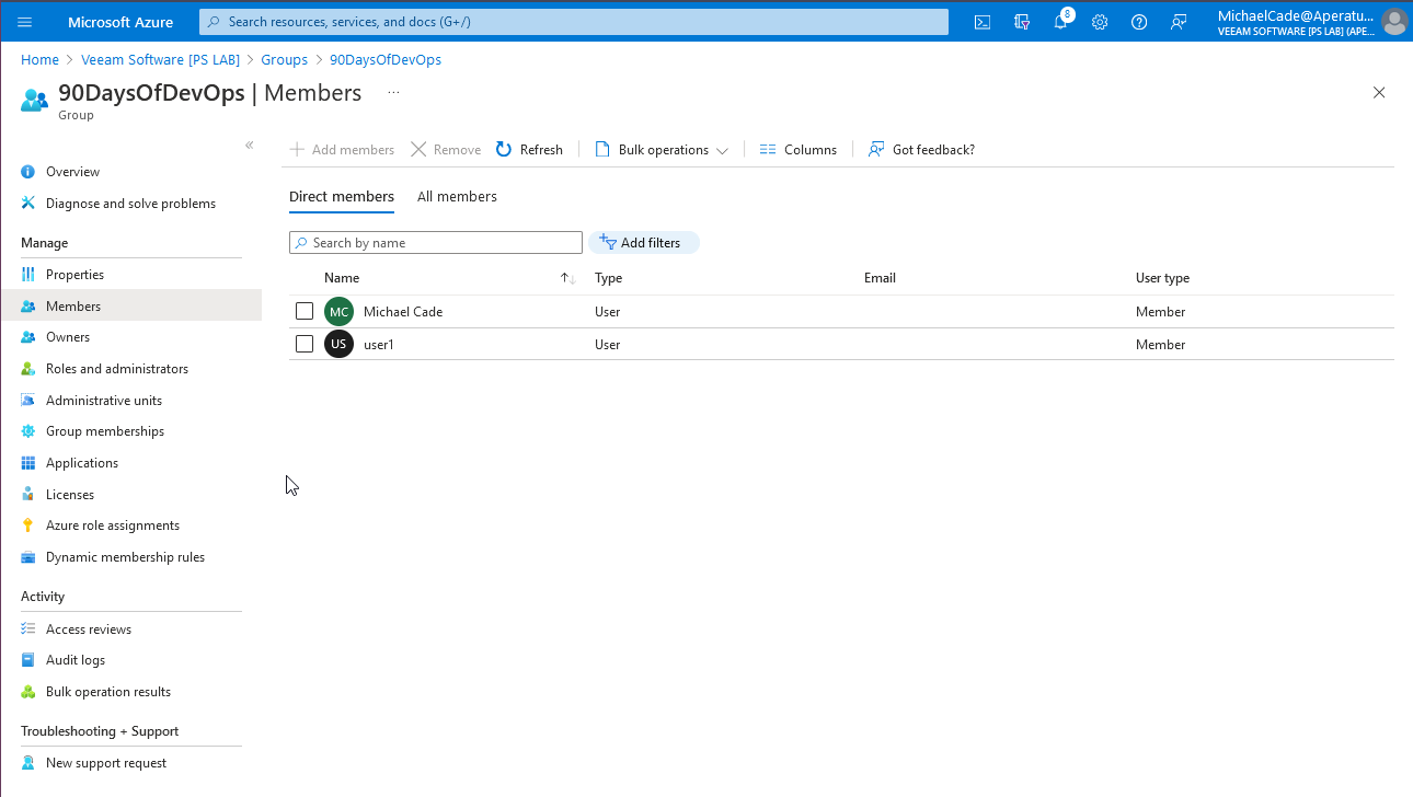 Sau đó, tôi thêm một người dùng user1@90DaysOfDevOps.com và nếu chúng ta kiểm tra nhóm, chúng ta có thể thấy các thành viên của nhóm mình.