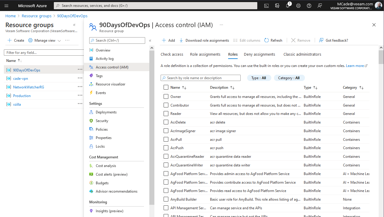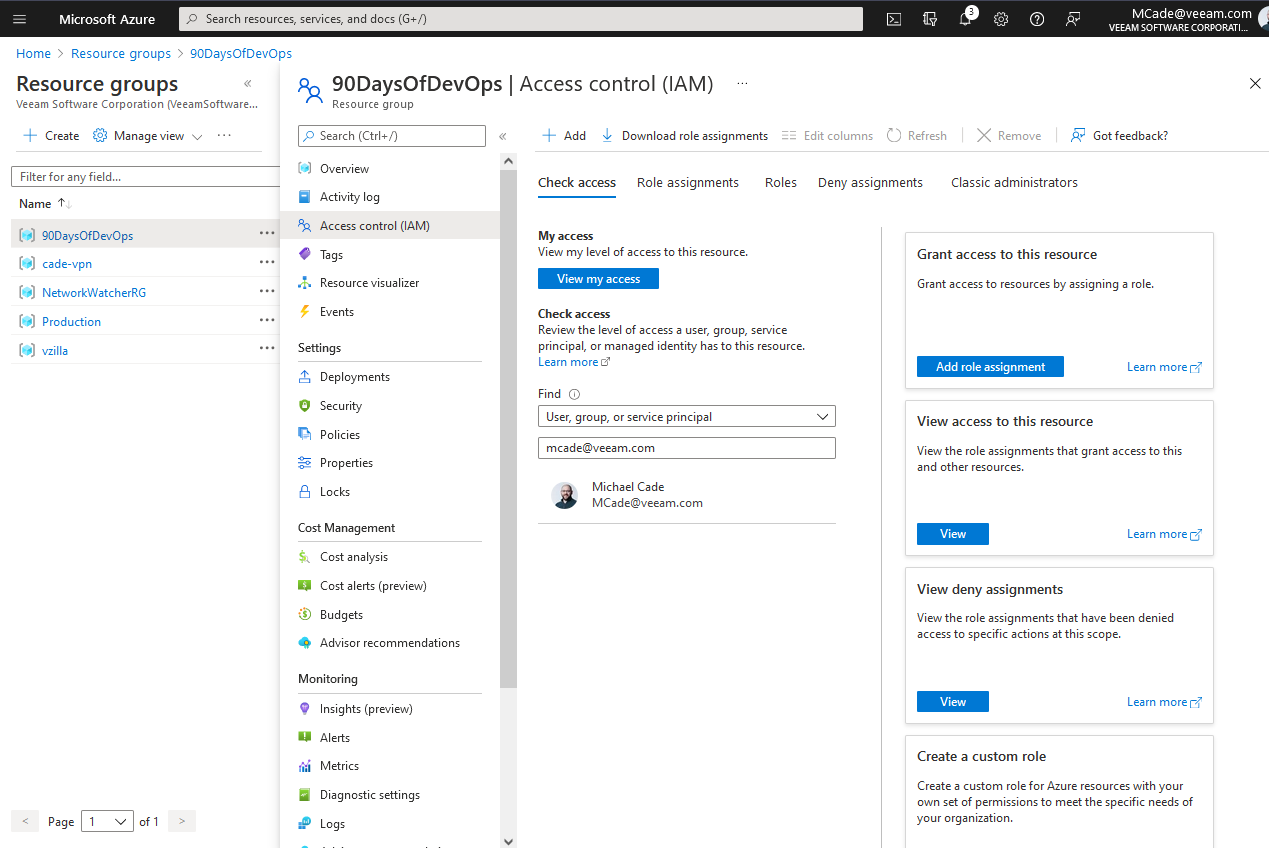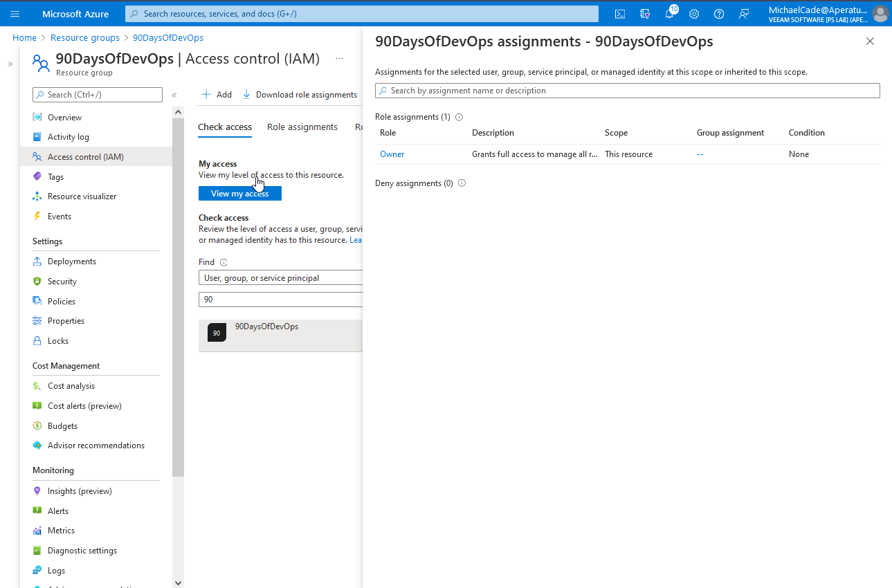 Bây giờ, chúng ta có thể vào Resource group của mình và chỉ định rằng trong nhóm tài nguyên 90DaysOfDevOps, chúng ta muốn chủ sở hữu (owner) của nó là nhóm chúng ta vừa mới tạo.