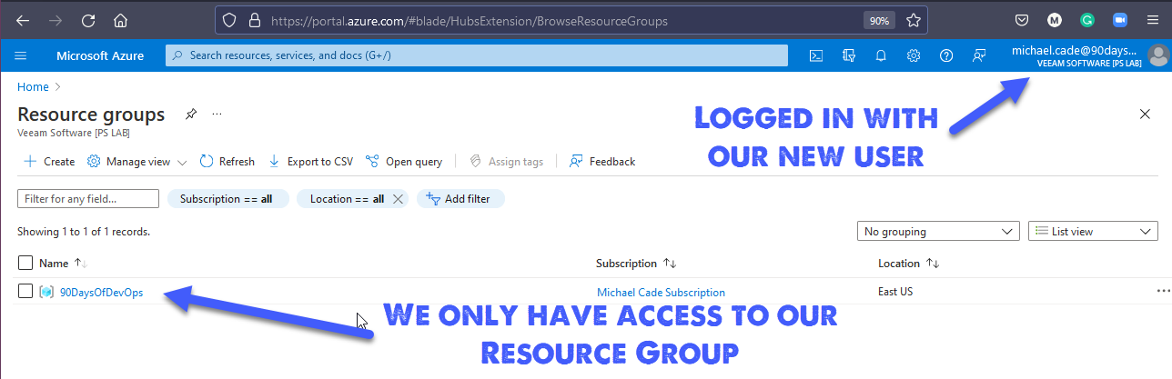 Bây giờ, nếu chúng ta đăng nhập và Azure Portal với tài khoản người dùng mới của chúng ta, bạn có thể thấy rằng chúng ta chỉ có quyền truy cập vào nhóm tài nguyên 90DaysOfDevOps của mình chứ không phải những nhóm khác được thấy trong các ảnh trước đó vì chúng ta không có quyền truy cập.