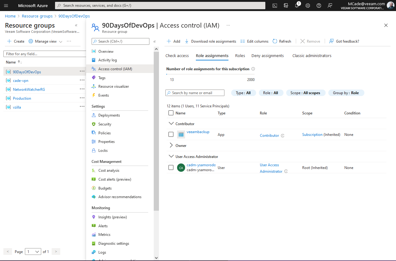 Nếu chúng ta quay lại nhóm tài nguyên "90DaysOfDevOps" và kiểm tra Access Control (IAM) của nó, bạn có thể thấy chúng ta có danh sách Contributors và một customer User Access Administrator, và chúng ta cũng có một danh sách các owners (nhưng tôi không thể công khai)