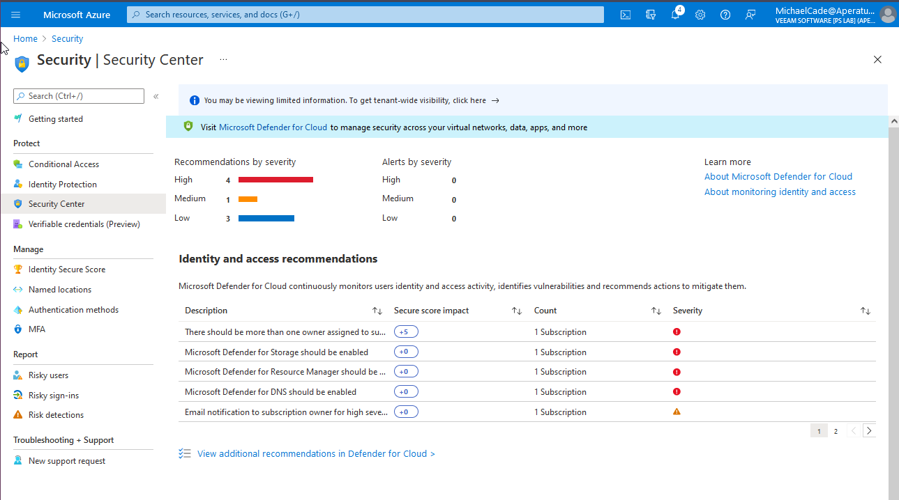 Tôi đã chuyển sang một subscription khác để xem Azure Security Center và bạn có thể thấy tại đây với rất ít tài nguyên, tôi có vài đề xuất về bảo mật tại cùng một nơi.