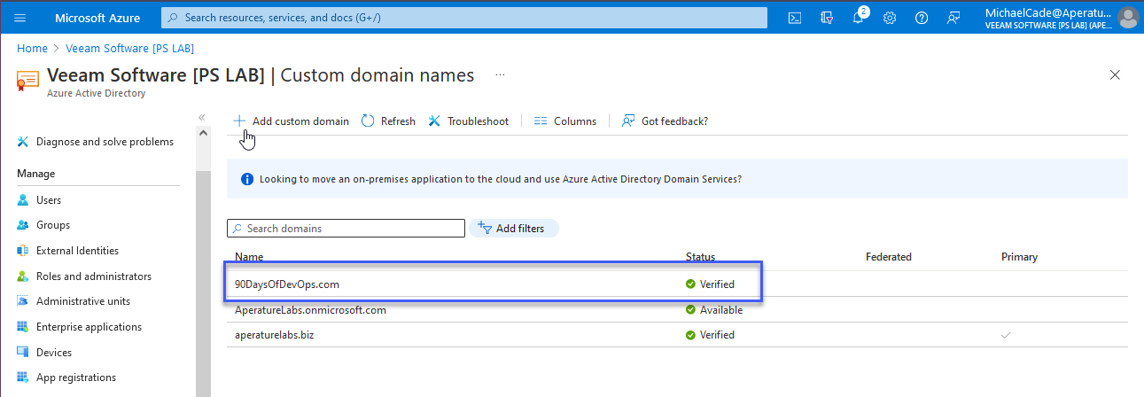Tôi đã mua tên miền www.90DaysOfDevOps.com và tôi muốn thêm tên miền này vào Azure Active Directory portal của mình, Thêm tên miền tuỳ chọn của bạn bằng Azure Active Directory portal