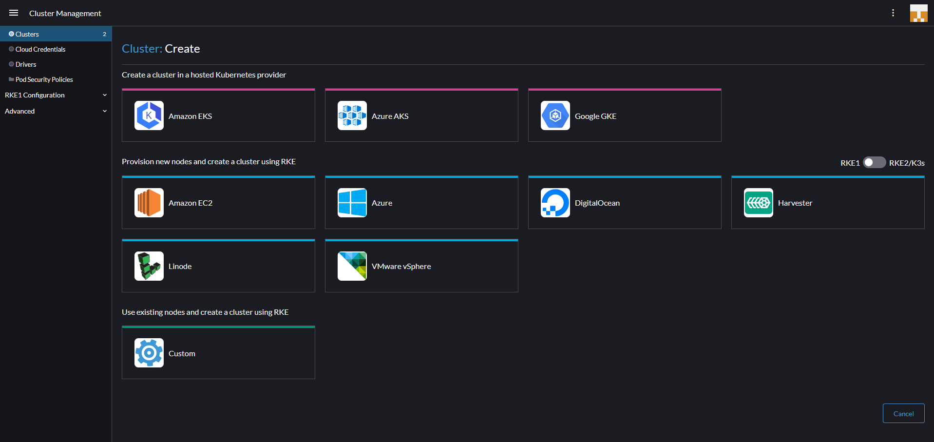 Bây giờ chúng ta đã có các nodes hoặc máy ảo sẵn sàng, sau đó chúng ta có thể sử dụng Rancher để tạo Kubernetes cluster mới của mình. Màn hình đầu tiên để tạo cluster của bạn cung cấp cho bạn một số tuỳ chọn về vị trí của cluster, ví dụ như các dịch vụ Kubernetes được quản lý trên đám mây công cộng, vSphere hoặc lựa chọn khác.