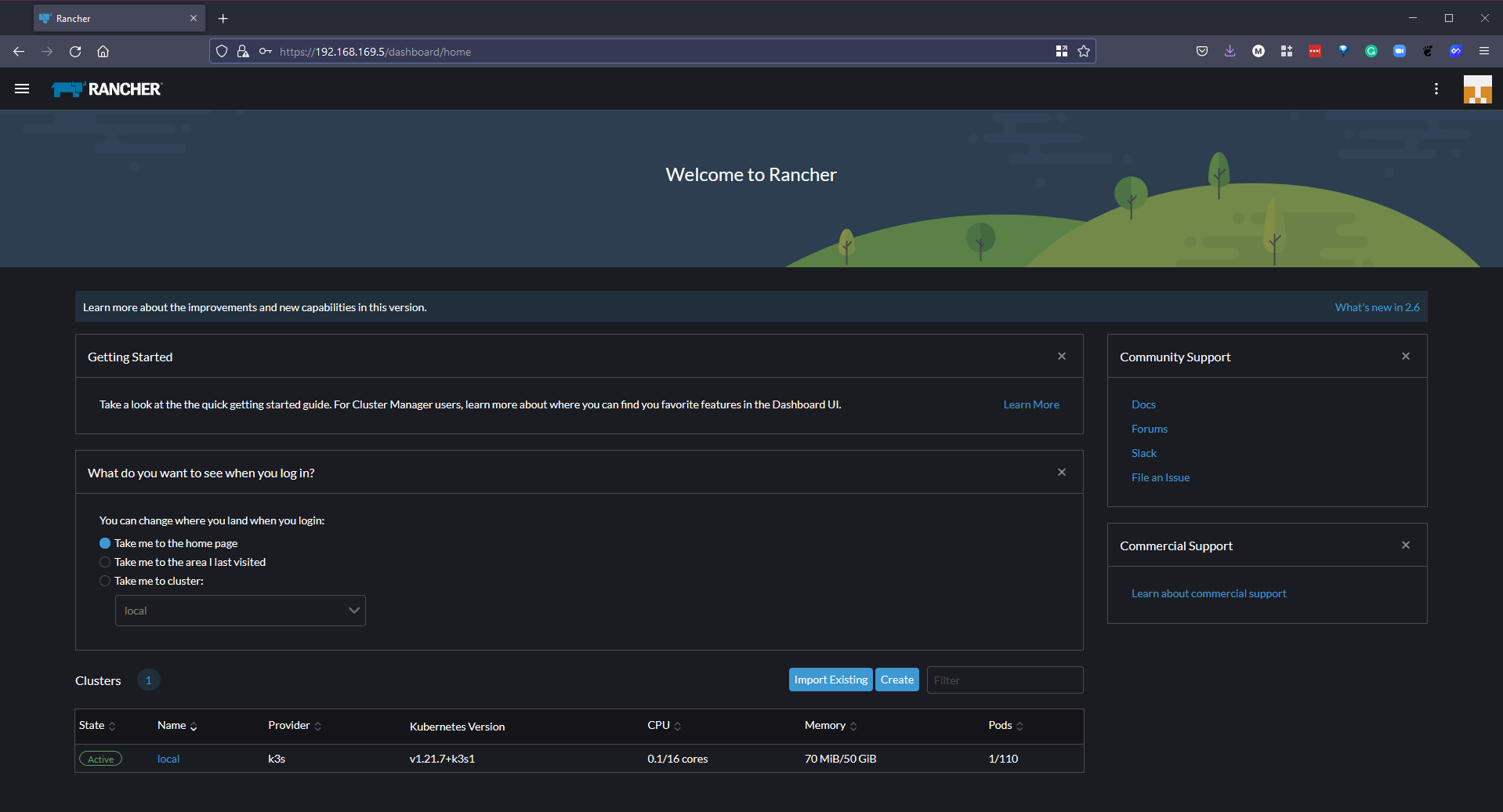 Khi chúng ta đã làm những điều trên, chúng ta sẽ đăng nhập và có thể thấy màn hình sau. Là một phần của triển khai Rancher, chúng ta cũng thấy một K3s cluster được tạo.