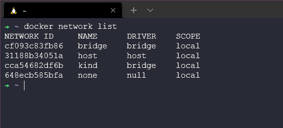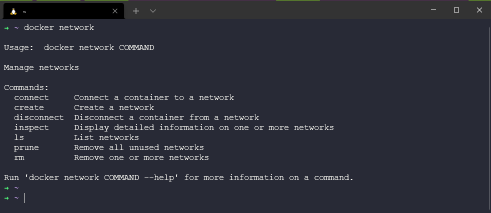 Theo như bên dưới, bạn có thể thấy đây là cách chúng ta có thể sử dụng lệnh và các lệnh phụ có sẵn. Chúng ta có thể tạo các mạng mới, liệt kê cách mạng hiện có, kiểm tra và xoá các mạng.