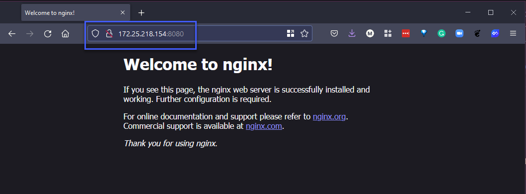 Sau đó, chúng tôi có thể lấy IP này, mở trình duyệt và truy cập http://172.25.218.154:8080/ IP của bạn có thể khác. Điều này xác nhận rằng có thể truy cập được NGINX.