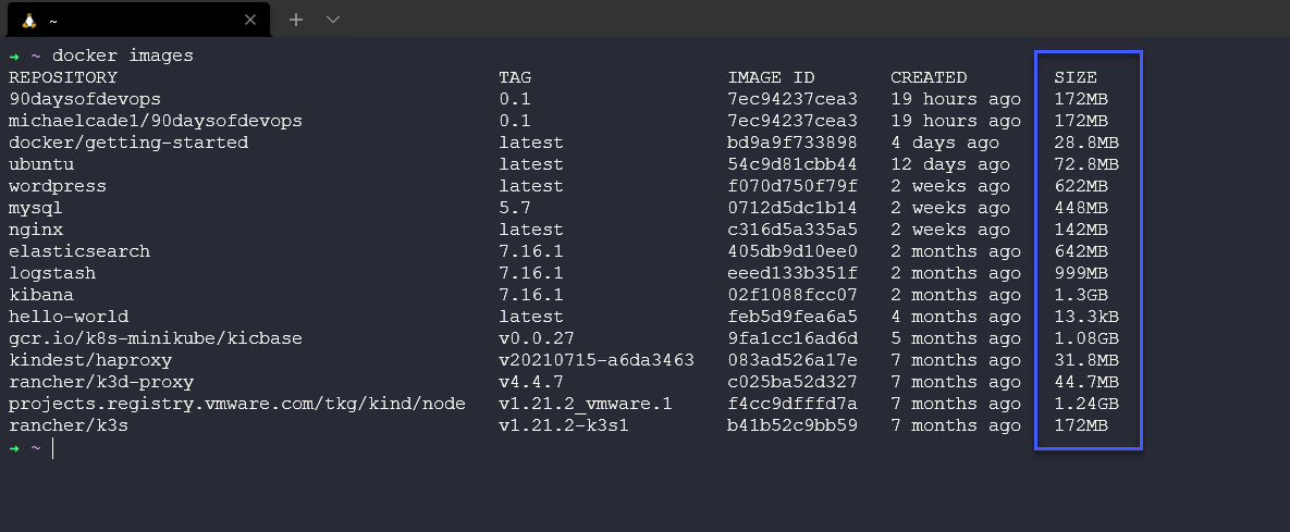 docker image là một câu lệnh tốt để kiểm tra kích thước các image của bạn.