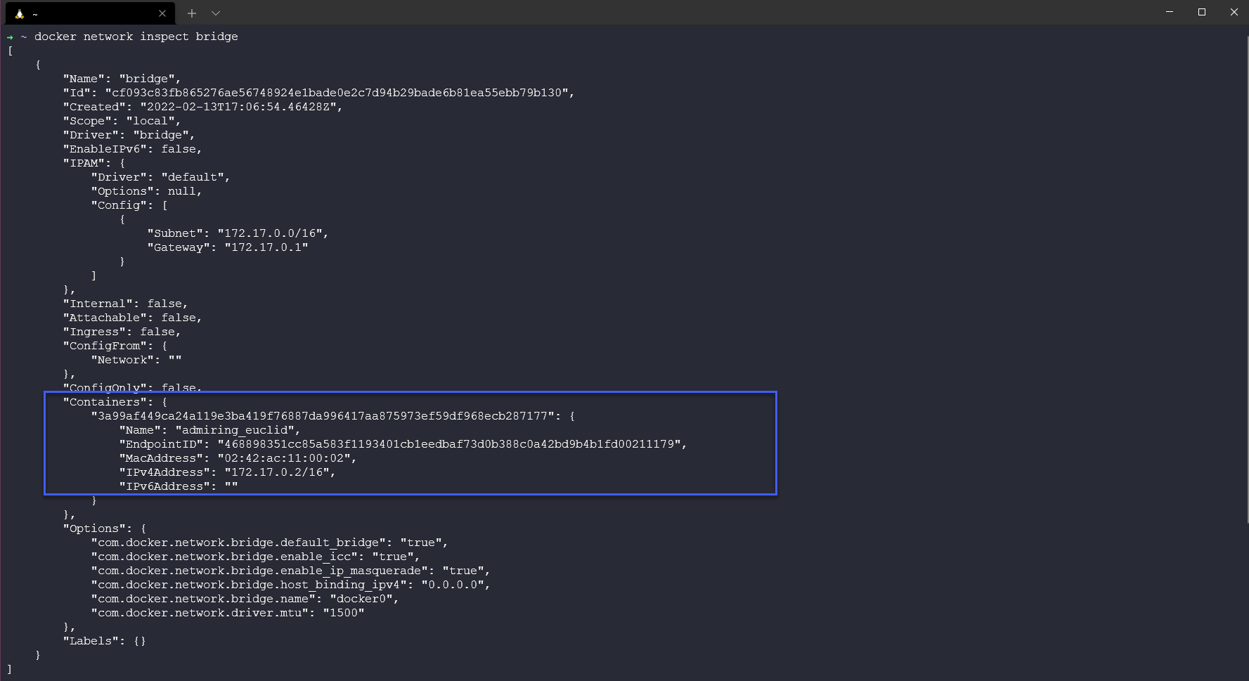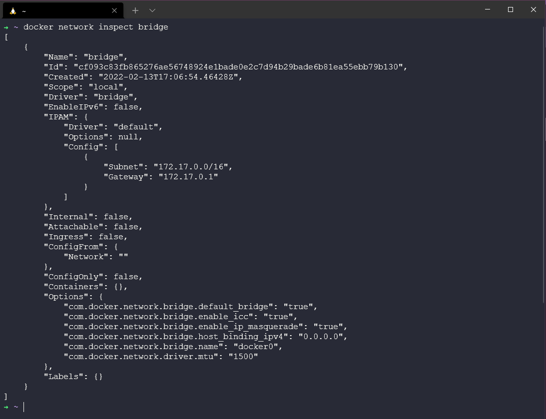 Khi tôi chạy lệnh docker network inspect bridge, tôi có thể nhận được tất cả các chi tiết cấu hình của mạng cụ thể đó. Điều này bao gồm tên, ID, driver, container được liên kết và như bạn thấy, có rất nhiều thông tin khác.