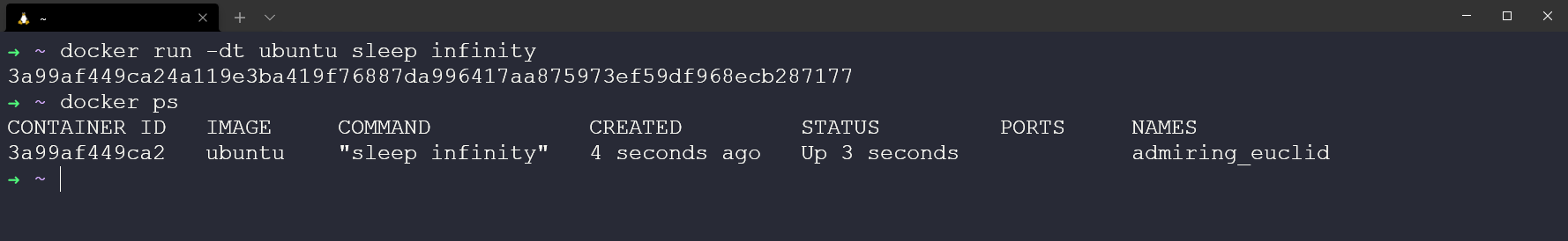 Hãy tạo một container mới với câu lệnh docker run -dt ubuntu sleep infinity