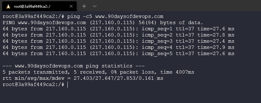 Từ đây, image của chúng ta không có gì để ping nên chúng ta cần chạy thêm lệnh sau apt-get update && apt-get install -y iputils-ping sau đó ping một địa chỉ bên ngoài. ping -c5 www.90daysofdevops.com