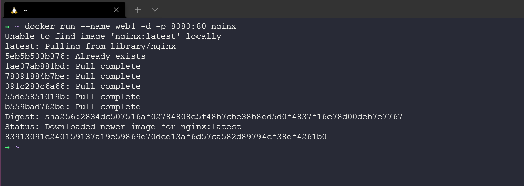 Bắt đầu một container mới dựa trên NGINX image chính thức bằng cách chạy docker run --name web1 -d -p 8080:80 nginx