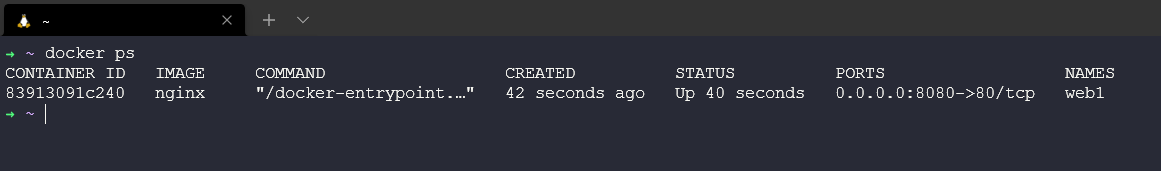Dòng trên cùng hiển thị container web1 mới đang chạy NGINX. Lưu ý lệnh mà container đang chạy cũng như port mapping - 0.0.0.0:8080->80/tcp ánh xạ cổng 8080 trên tất cả các interfaces của máy chủ tới cổng 80 bên trong container web1. Port mapping này là yếu tố làm cho dịch vụ web của container có thể truy cập hiệu quả từ bên ngoài (thông qua địa chỉ IP máy chủ Docker trên cổng 8080).