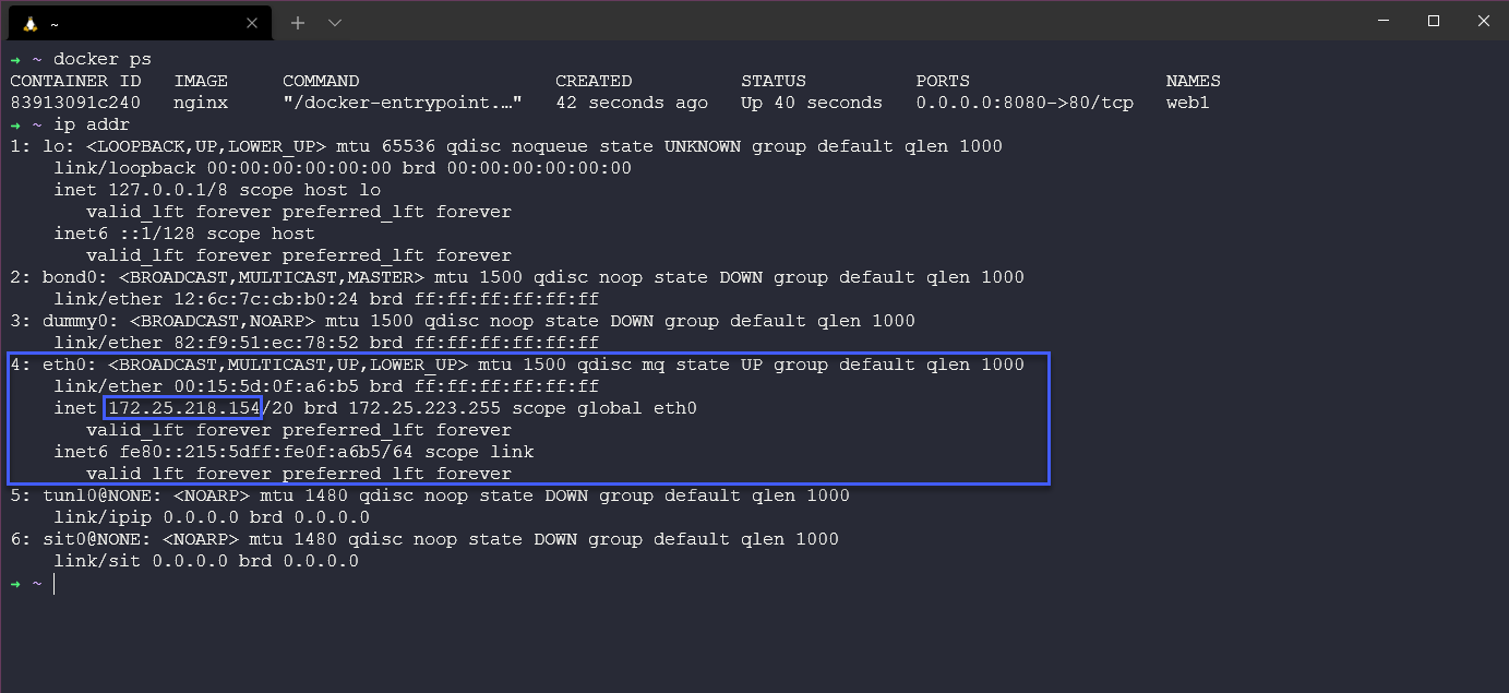 Bây giờ chúng ta cần địa chỉ IP cho máy chủ thực tế của mình, có thể thực hiện việc này bằng cách vào WSL terminal của mình và sử dụng lệnh IP addr.