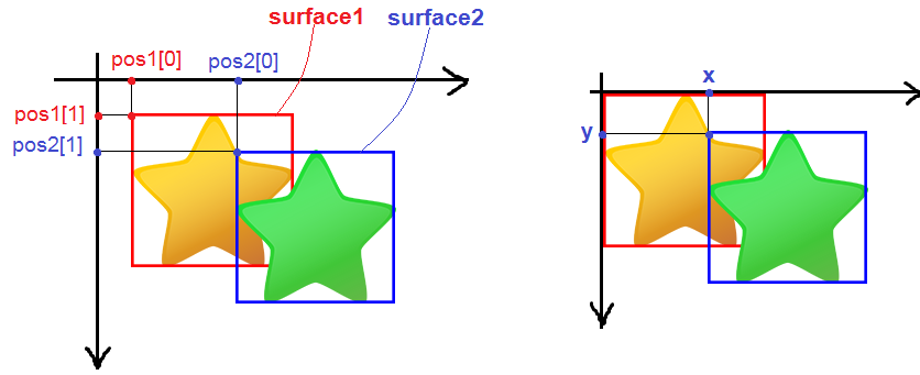 Bây giờ hãy tìm hiểu hàm collision(surface1,pos1,surface2,pos2) đây chính là hàm để kiểm tra va chạm. Trong đó tham số pos1 có dạng (x, y) là vị trí của surface1, pos2 cũng tương tự.