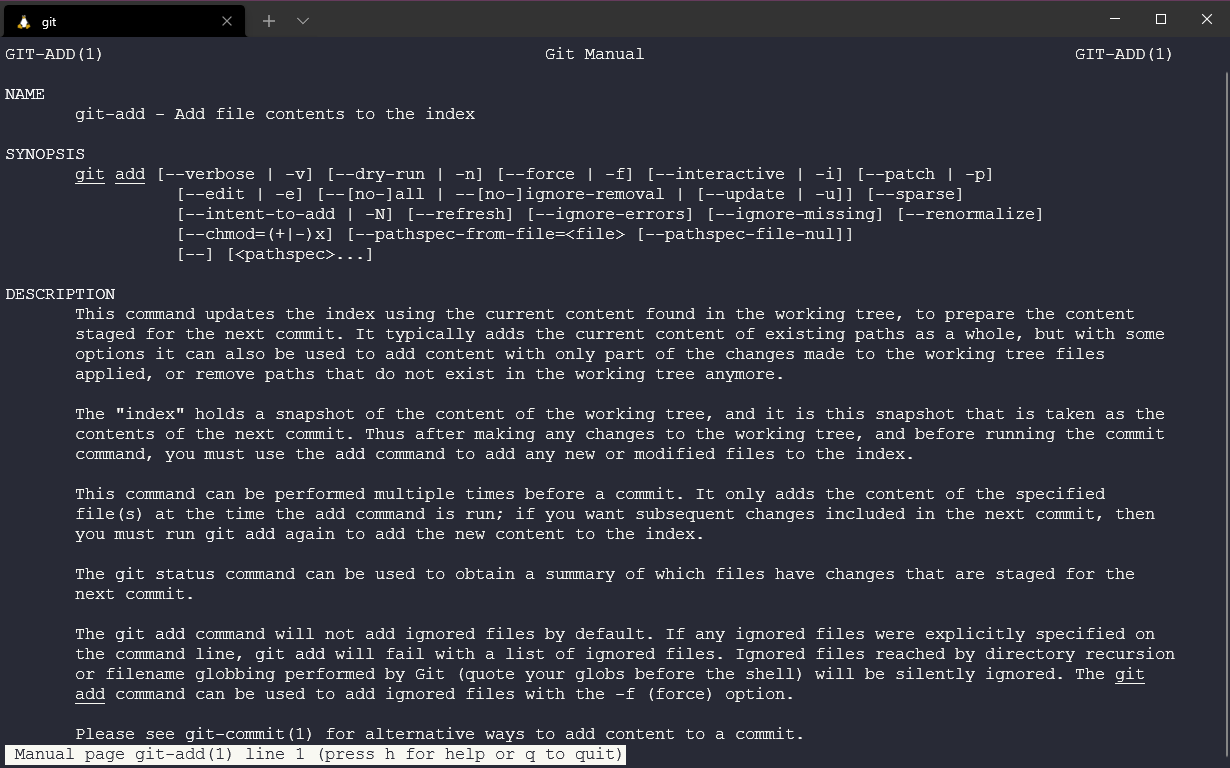 Chúng ta cũng có thể truy cập tài liệu tương tự sau, điều này cực kỳ hữu ích nếu bạn không có kết nối nào từ terminal. Ví dụ: nếu chúng ta sử dụng lệnh git add, chúng ta có thể chạy git add --help và đọc hướng dẫn dưới đây.