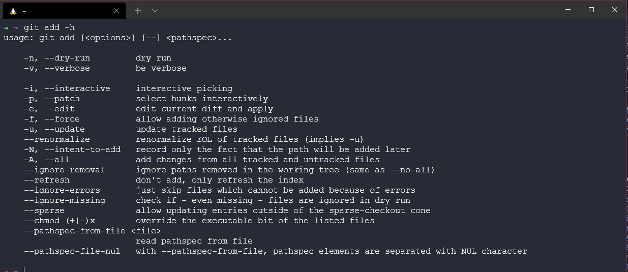 Chúng ta cũng có thể dụng git add -h để cung cấp tống hợp các tuỳ chọn có sẵn mà chúng ta có thể sử dụng.