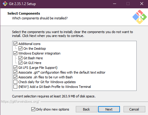 Bây giờ chúng ta có thể chọn các thành phần bổ sung mà chúng ta muốn cài đặt cũng như liên kết với git. Trên Windows, tôi luôn đảm bảo rằng mình đã cài đặt Git Bash vì điều này cho phép chúng ta chạy các lệnh bash trên Windows.