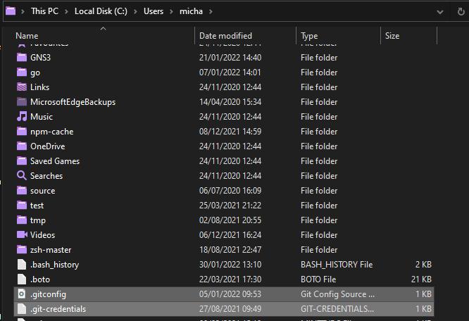 Trên tất cả các máy, tệp này sẽ được đặt tên là .gitconfig. Trên máy Windows của tôi, bạn sẽ tìm thấy tệp này trong thư mục người dùng của mình.
